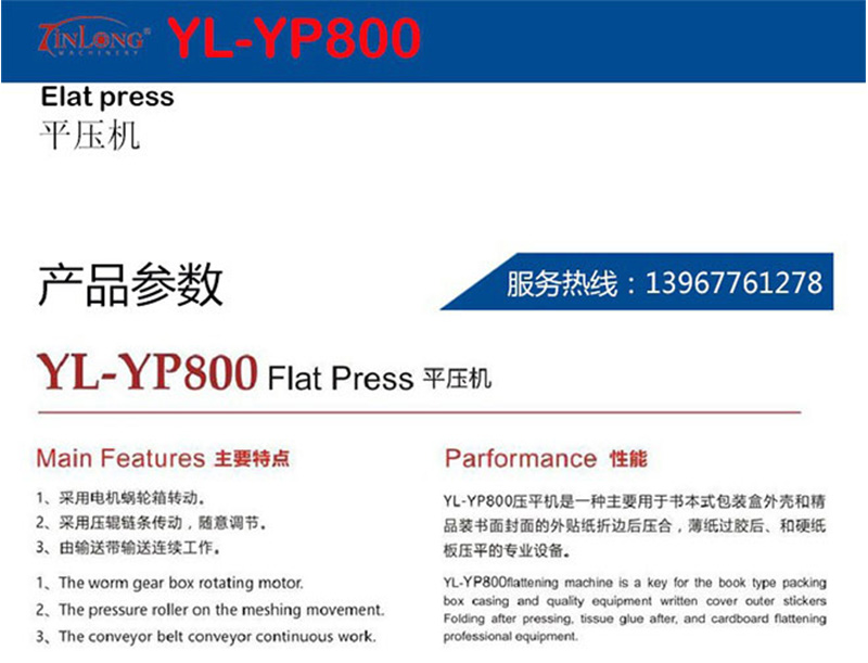 簡要描述:YL-YP800平壓機(jī) YL壓平機(jī)是一種主要用于書本式包裝盒外殼和精品裝書面封面的外貼紙折邊后壓合,薄紙過膠后,和硬紙板壓平的專業(yè)設(shè)備。 主要特點(diǎn): 1,采用電機(jī)蝸輪箱轉(zhuǎn)動。...
