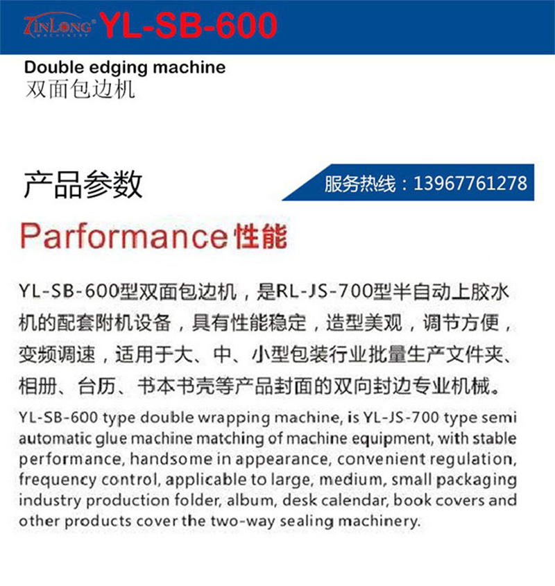 雙面包邊機(jī)是RL-JS-700型半自動(dòng)上膠水機(jī)的配套附機(jī)設(shè)備,具有性能穩(wěn)定,造型美觀,調(diào)節(jié)方便,變頻調(diào)速,適用于大,中,小型包裝行業(yè)批量生產(chǎn)文件夾,相冊(cè),臺(tái)歷,書本殼等產(chǎn)品封面的雙向封邊專業(yè)機(jī)械。在使用中具有性能穩(wěn)定,方便利用的優(yōu)勢(shì),長(zhǎng)期的使用還具有耐腐蝕與抗銹的效果,造型簡(jiǎn)單大方,使用調(diào)節(jié)便利化,很方便。